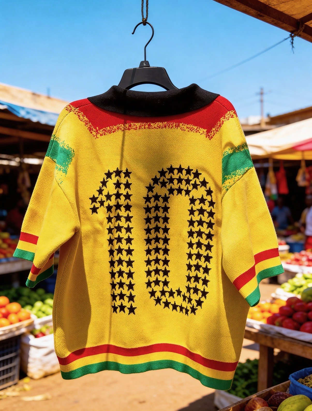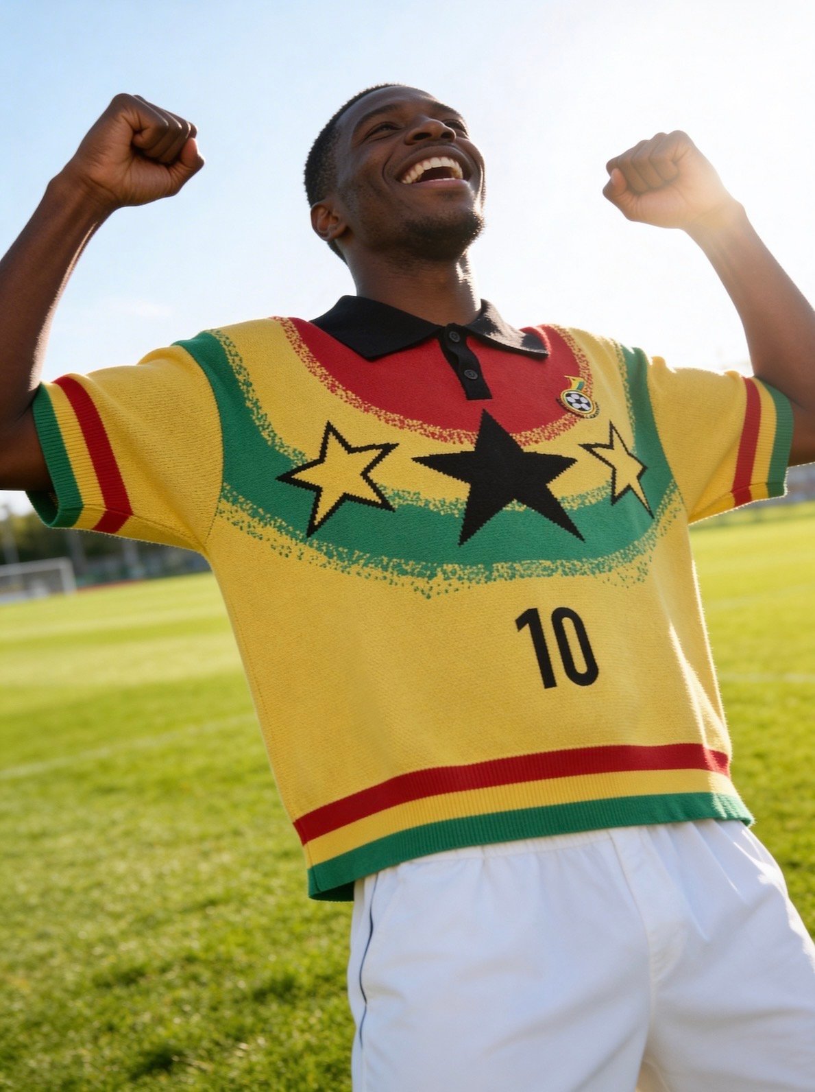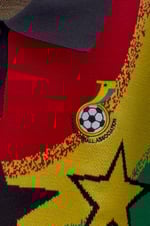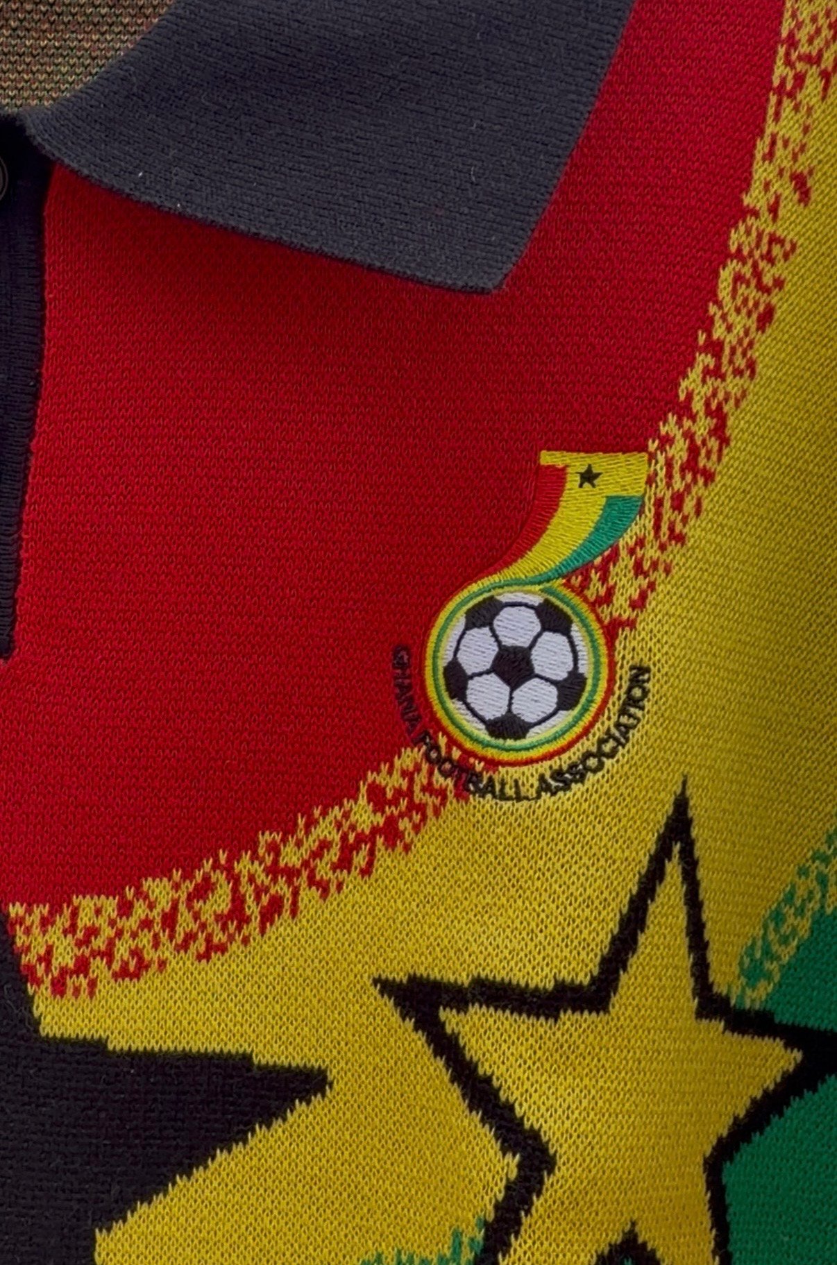 A vibrant, knit-style polo jersey paying tribute to the Ghana National Football Team, known as the Black Stars. The design prominently features the iconic colors of the Ghanaian flag. Red, yellow, green, and black, with a bold, retro aesthetic.